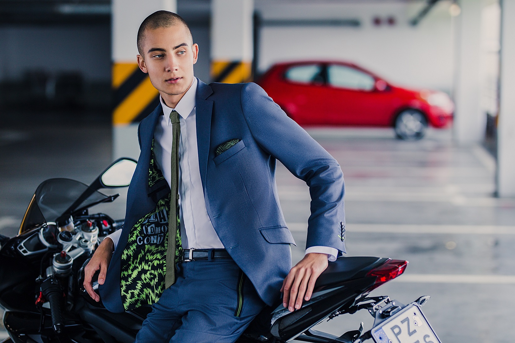 Nie zabrakło propozycji dla tych, którym bliższy jest minimalizm i niekoniecznie chcą wyróżniać się w tłumie. Klasyczny, granatowy garnitur z neonową wypustką w środku to mały akcent, o którym będzie wiedział tylko sam użytkownik modelu. Wszystkie modele wykonane zostały w fasonie Super Slim, przy jednoczesnym wykorzystaniu elastycznych tkanin, niekrępujących ruchów.