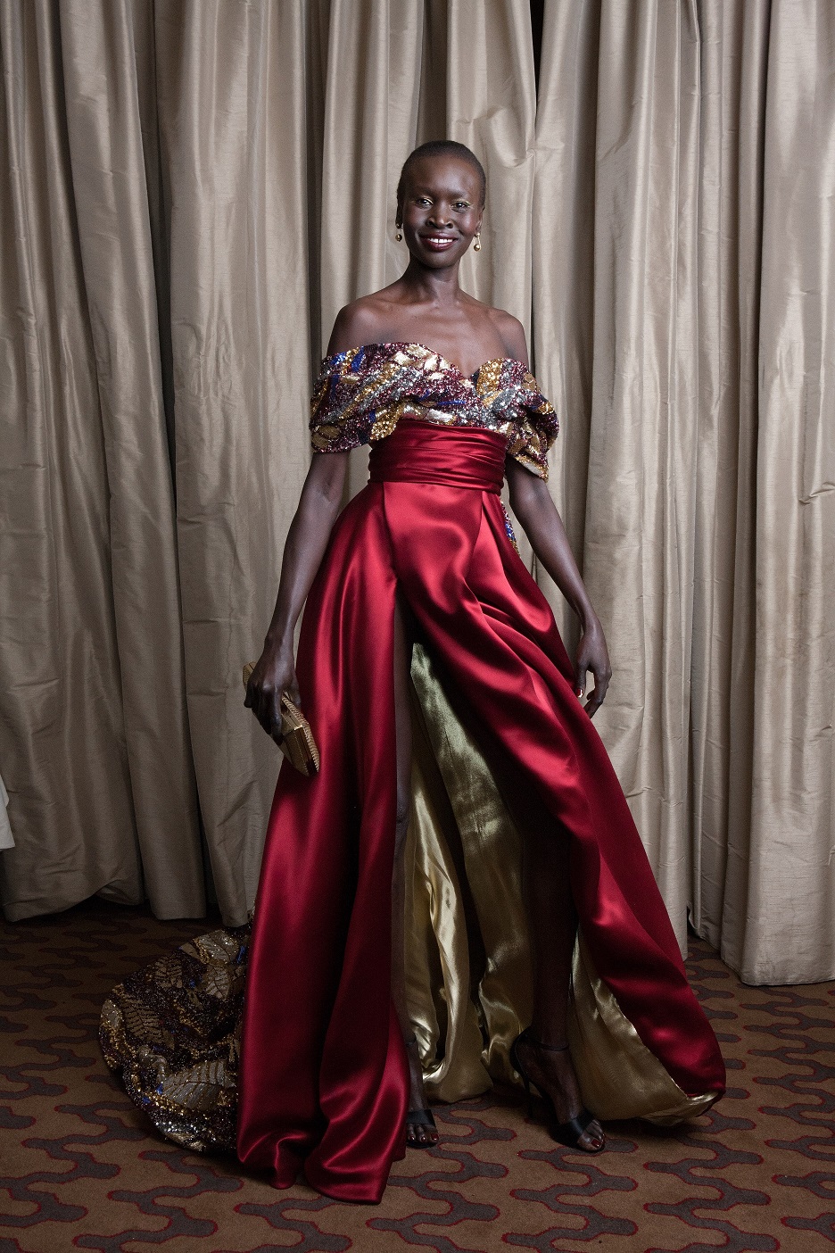 Modelka i aktywistka Alek Wek założyła drapowaną suknię z lejącego się materiału w mozaikowy wzór. Długi tren wyszywany paciorkami i cekinami mienił się odcieniami srebra oraz kamieni szlachetnych, wzór przywodzący na myśl barwną mozaikę zdobił też gorset sukni. Kolorowa góra kontrastowała z szarfą w talii oraz uszytą z dwóch warstw jedwabiu spódnicą z wysokim wycięciem – jej wierzch miał barwę wina, a spód przyciągał wzrok złotym blaskiem.