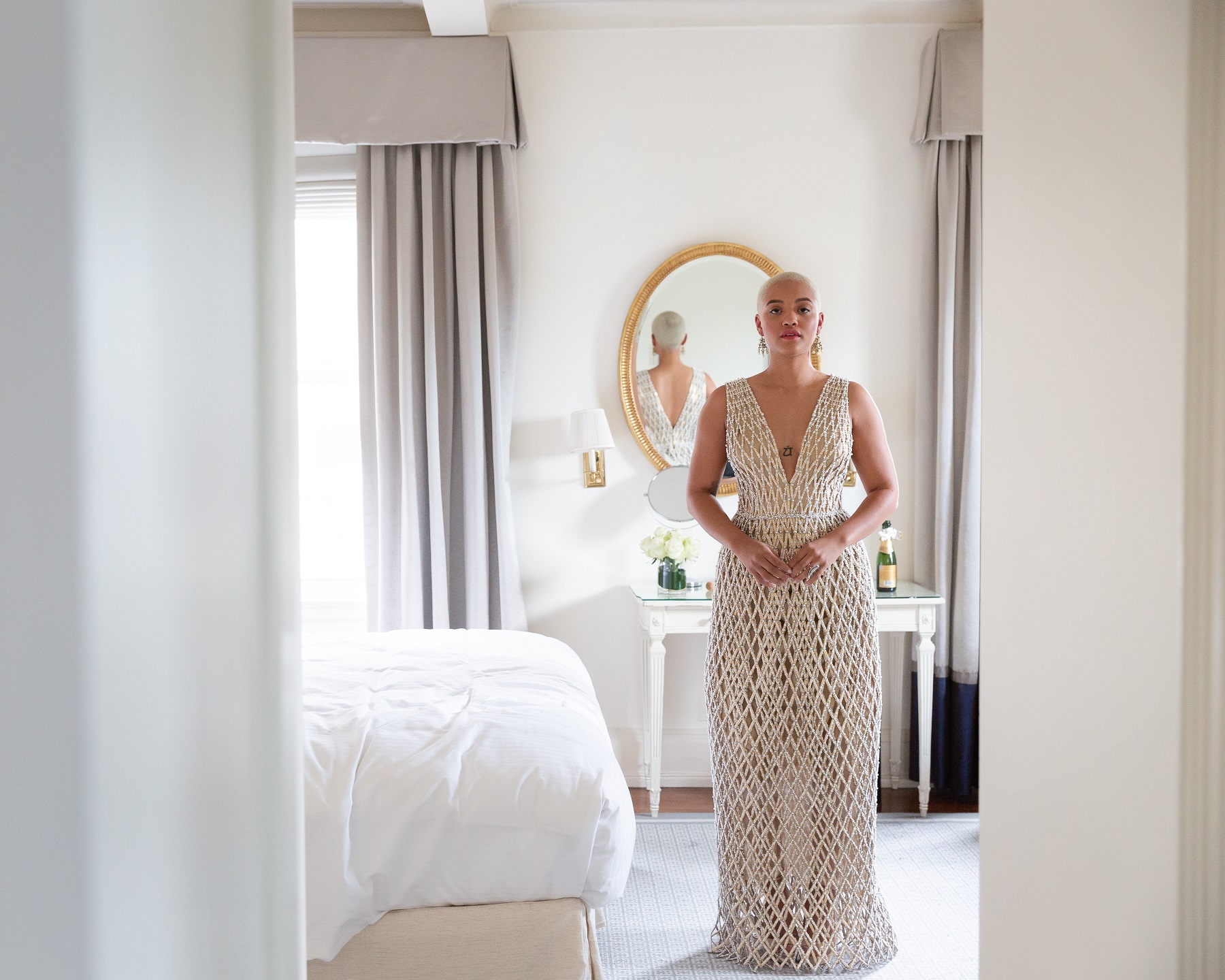 Modelka i aktorka Jasmine Sanders założyła drapowaną na ramionach suknię z metalicznej lamy w kolorze starego złota. Szeroka spódnica efektownie opadała ku ziemi, a wysokie wycięcie eksponowało nogi Jasmine i sprawiało, że całość nabrała nowoczesnej lekkości.