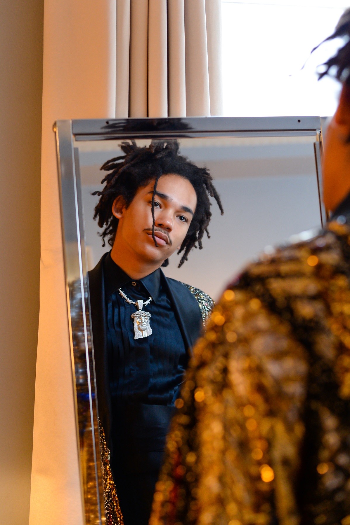 Model i influencer Luka Sabbat wystąpił w ekstrawaganckim płaszczu ozdobionym ręcznie naszywanymi cekinami w kolorach starego srebra, głębokiej czerwieni, burgunda, złota i kobaltu. Szalowy kołnierz i podszewka zostały wykonane z czarnego jedwabiu. Luka założył też spodnie od smokingu uszyte z materiałów przyjaznych dla środowiska: organicznego jedwabiu, tencelu i wełny.