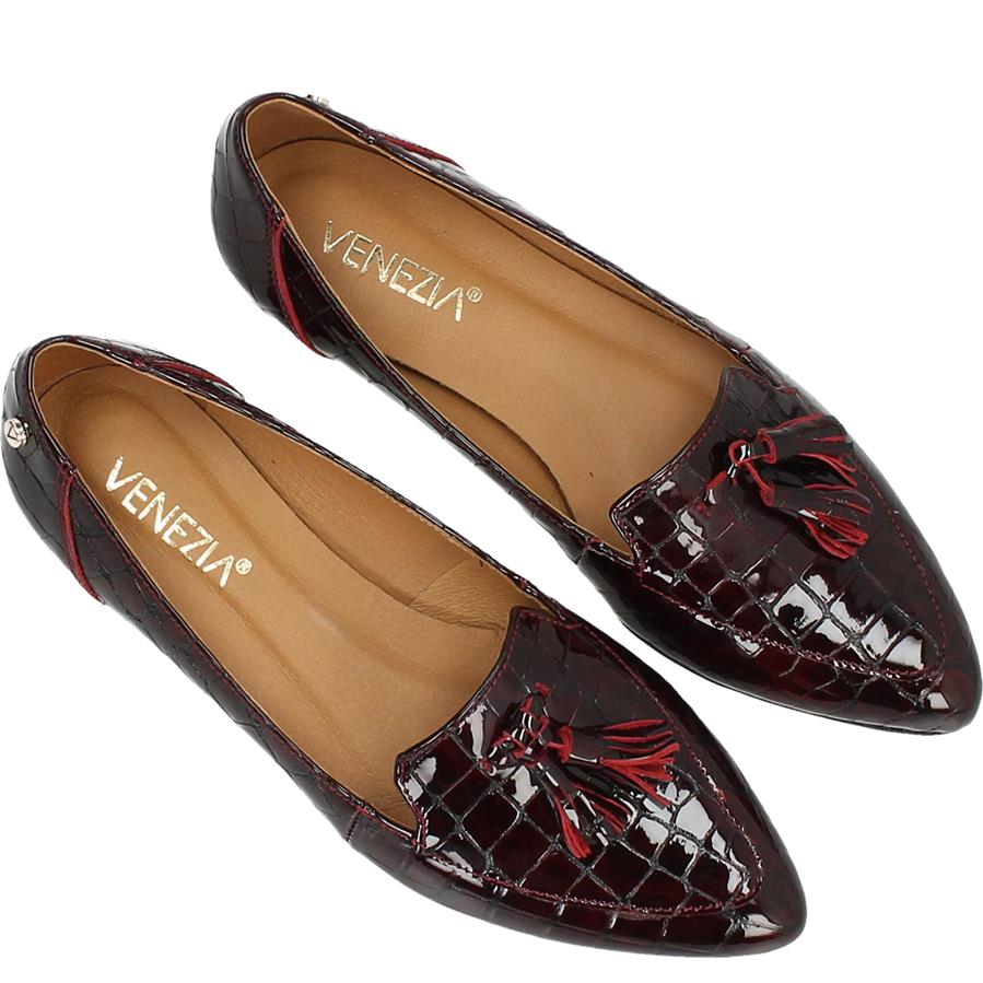 Z pewnością spodobają ci się też bordowe mokasyny z lakierowanej skóry naturalnej. Mają one krótką, idealnie wyprofilowaną cholewkę tłoczoną we wzór skóry krokodyla. Taka cholewka zapewnia wygodę podczas wielogodzinnego noszenia obuwia. To idealne półbuty do biura. Mają noski w szpic oraz niebanalne obszycia, a ponadto ozdobne frędzelki umieszczone ma przodzie buta. W tych eleganckich skórzanych mokasynach na pewnie będziesz czuć się komfortowo w każdej sytuacji.
