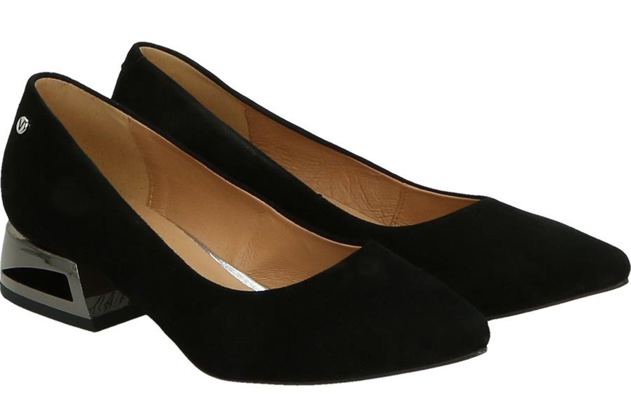 Jeśli nie czujesz się zbyt pewnie w szpilkach, wybierz czarne damskie czółenka na niskim obcasie, który przyciąga wzrok poprzez metaliczny połysk i charakterystyczne wycięcie. To modne buty z zamszowej skóry – wygodne i eleganckie. Zakończenie nosków w szpic nadaje temu modelowi klasycznego charakteru i sprawia, że będzie on pasować do każdej stylizacji. Możesz go nosić z czarnymi szerokimi spodniami lub założyć do zwiewnej sukienki.