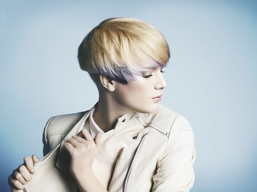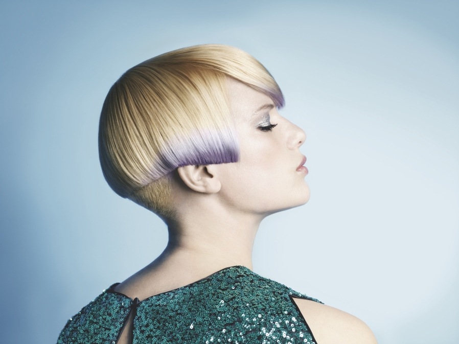 Ten jednocześnie elegancki i futurystyczny look powstał dzięki Wayne Tippetts (www.waynetippetts.com). Fryzura ma zapewniać wiele możliwości kreacji. Włosy układać można zarówno mocno nastroszone i utrwalone, jak i gładko czesać podkreślając mistrzostwo strzyżenia. Zwróciliście uwagę na kolor? Blond, elektryzujący błękit świetnie wyglądający na tle ciemnych u nasady włosów.