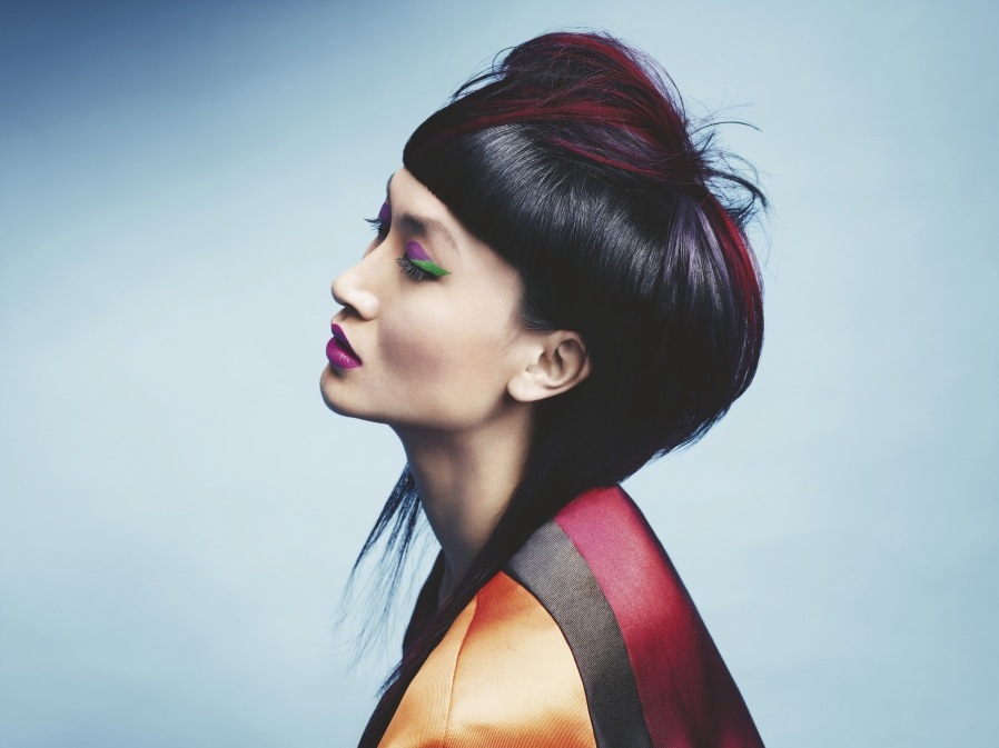 Autorką tego ekstrwaganckiego trendu jest Carole Touati (www.lelook.eu) z Barcelony. Krótką grzywkę uzupełniają dłuższe, proste i mocno przerzedzone pasma boczne. Fryzura jest dłuższa z tyłu, co sprawia, że zyskuje wielowarstwowość i wielowymiarowość. Przy prostowaniu włosów staje się asymetryczna. Kolor jest równie odważny jak cięcie. Niebiesko-czarna podstawa daje połysk i świetnie odbija jaśniejsze sekcje w mocnych kolorach.