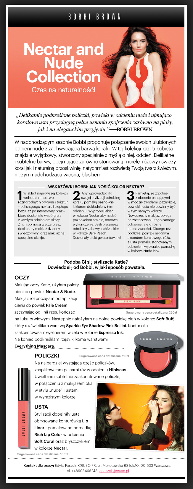W nadchodzącym sezonie Bobbi proponuje połączenie swoich ulubionych odcieni nude z zachwycającą barwą koralu. Taka stylizacja sprawdzi się doskonale zarówno na plaży jak i na eleganckim przyjęciu.