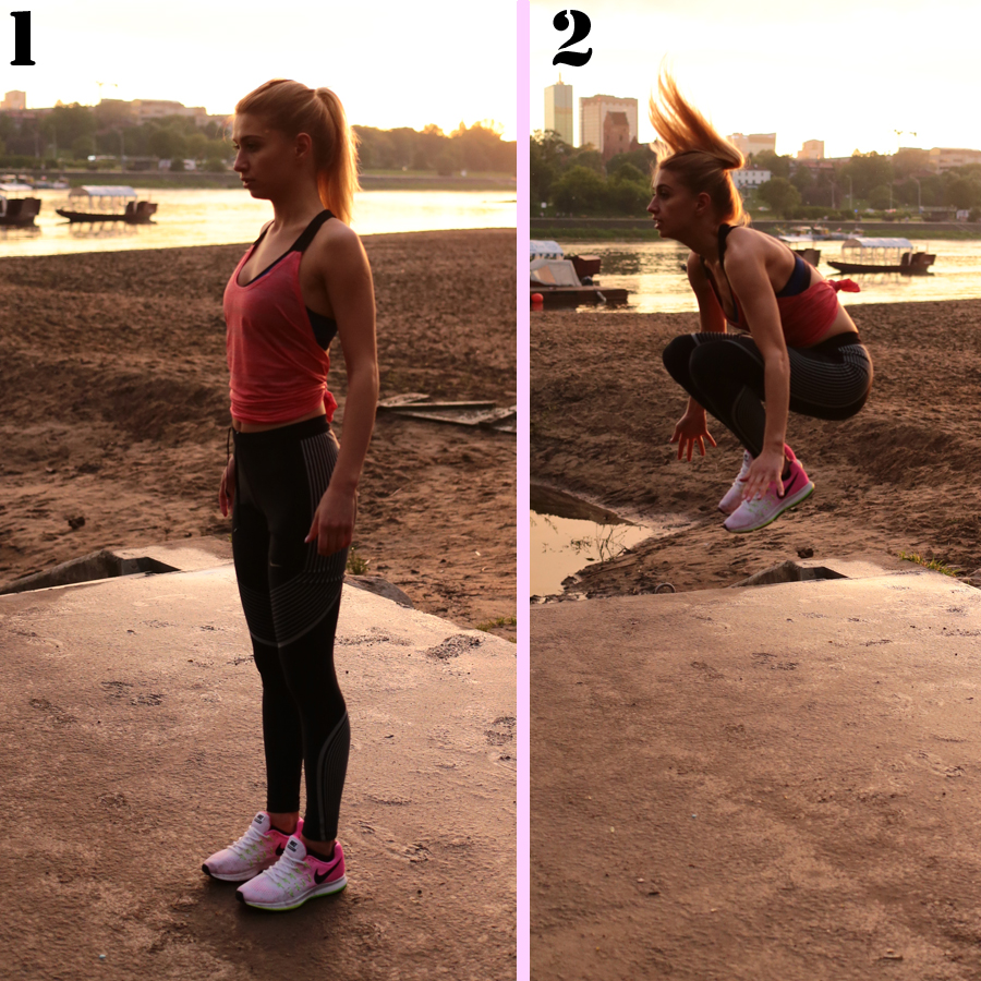 Wyskoki. Stań prosto w lekkim rozkroku. Delikatnie ugnij kolana i wyskocz jak najwyżej podciągając kolana do klatki piersiowej.