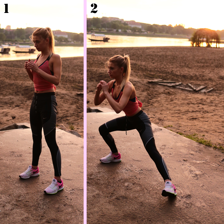 Wykroki boczne. Stań w lekkim rozkroku, ugnij prawe kolano jednocześnie wypychając biodra w tył i płynnym ruchem przesuń lewą nogę do pozycji wykroku bocznego. Wróć do pozycji i zmień nogę.