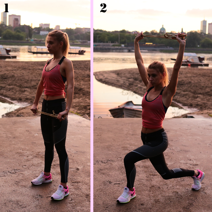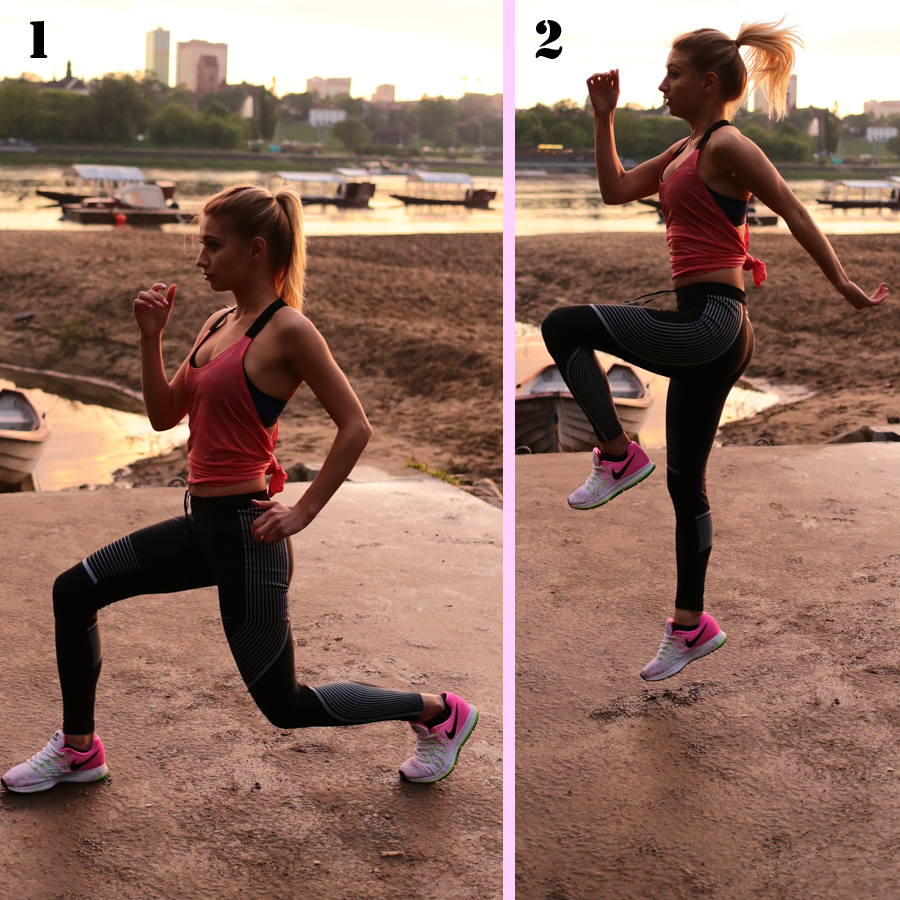 Zakrok z wyskokiem. Wykonaj zakrok i dynamicznie wyskocz w górę, unosząc kolano nogi zakrocznej. Zmień nogę i powtórz ćwiczenie.