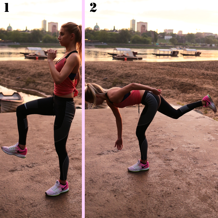 Żuraw. Stań na jednej nodze, drugą zegnij w stawie kolanowym i biodrowym. Powoli zacznij się pochylać, jednocześnie przenosząc lekko wyprostowaną nogę do tyłu. Wróć do pozycji wyjściowej. Zmień nogę, powtórz ćwiczenie.