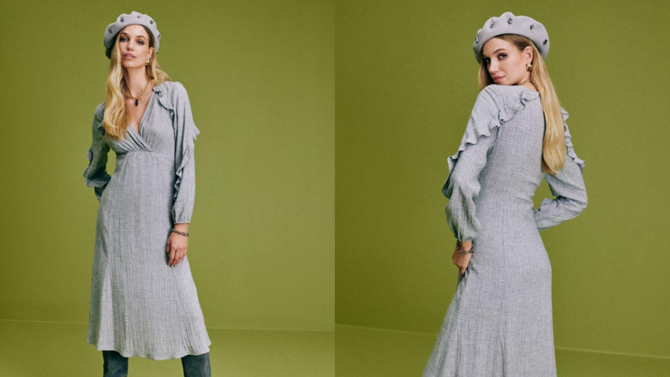 Szary kolor jest niesamowicie modny tej zimy, ale warto też docenić to, że pasuje chyba każdej kobiecie i świetnie współgra niemal z wszystkimi kolorami. Oprócz szarych spodni i żakietu, warto też mieć w swojej szafie szarą sukienkę za kolano uszytą z materiału na bazie miękkiej w dotyku wiskozy. Model z długimi rękawami, kopertowym dekoltem i falbanami przy ramionach interesująco wygląda w połączeniu z zamszowymi kozakami w nieco ciemniejszym odcieniu szarości i ze złotą biżuterią.