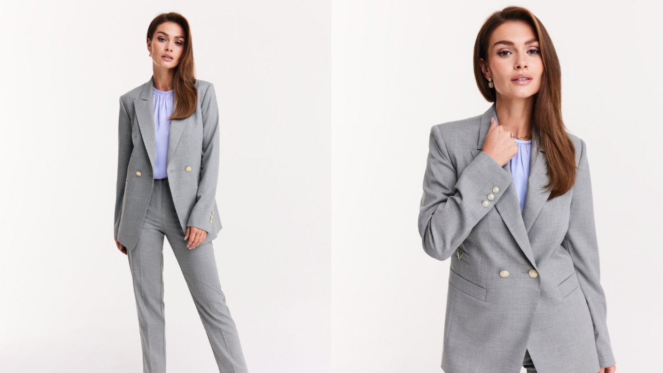 Szary dwurzędowy żakiet w duecie z szarymi spodniami garniturowymi to doskonała baza dla dziennych stylizacji do pracy, na konferencje biznesowe, a także na spotkanie przy kawie w eleganckim miejscu. Klasyczna forma żakietu sprawia, że dobrze leży na różnych kobiecych sylwetkach i dobrze wygląda z rozmaitymi bluzkami i topami. Idealnie pasują do niego spodnie z dopasowanymi, świetnie skrojonymi nogawkami i z wysokim stanem. Dzięki swojemu fasonowi spodnie te wydłużają nogi i dodają sylwetce lekkości.