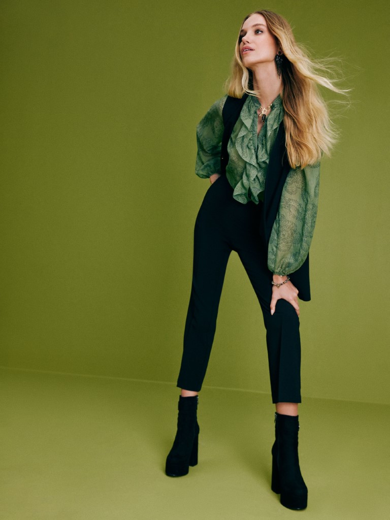 Do żakietu i spodni pasują na przykład błękitna bluzka z okrągłym dekoltem z drapowaniem, duża chusta z kwiatowym wzorem i złoty biżuteryjny pasek. Znajdź także inne eleganckie damskie spodnie na wyprzedaży i uzupełnij swoją zimową garderobę, tak abyś zawsze miała pomysł na stylowy look!
